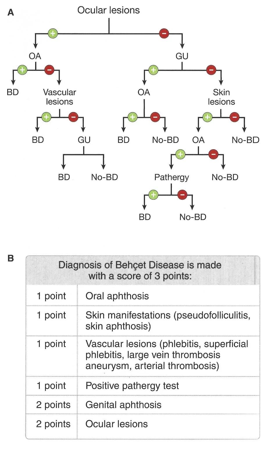 이러한 증상에 크론병(입에서 항문까지의 소화관 내벽에 염증과 궤양을 동반하는 질환, 보통 소장과 대장의 접합부인 회맹부에 자주 보임)을 동반하거나 안구의 포도막(홍채+모양체+맥락막)의 염증을 동반하기도 합니다.